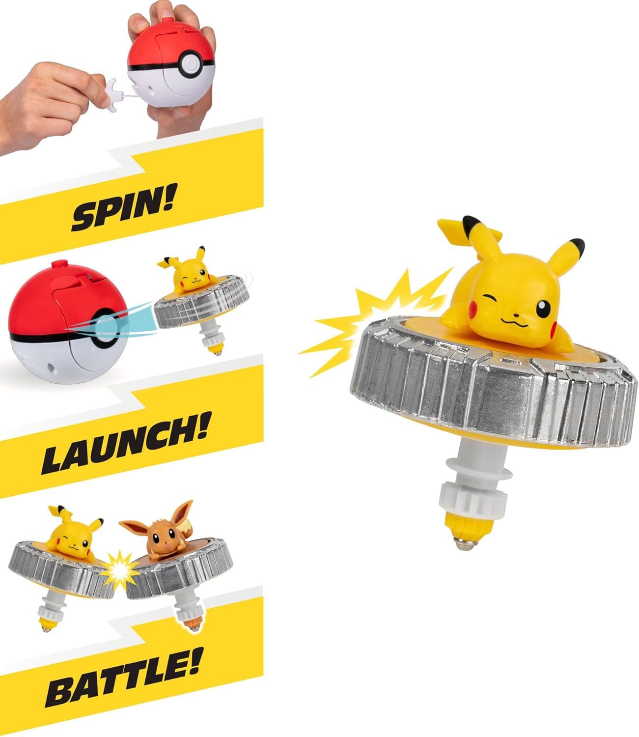 Get ready for thrilling head-to-head duels with the Pokémon Battle Spinner. Place the Battle Spinners into the Pokéball launchers and pull the cord. Then, press the top button on each Pokéball to launch the Battle Spinners into the arena. Experience nerve-wracking duels side by side with your favourite Pokémon. Officially licensed Pokémon product by Jazwares.