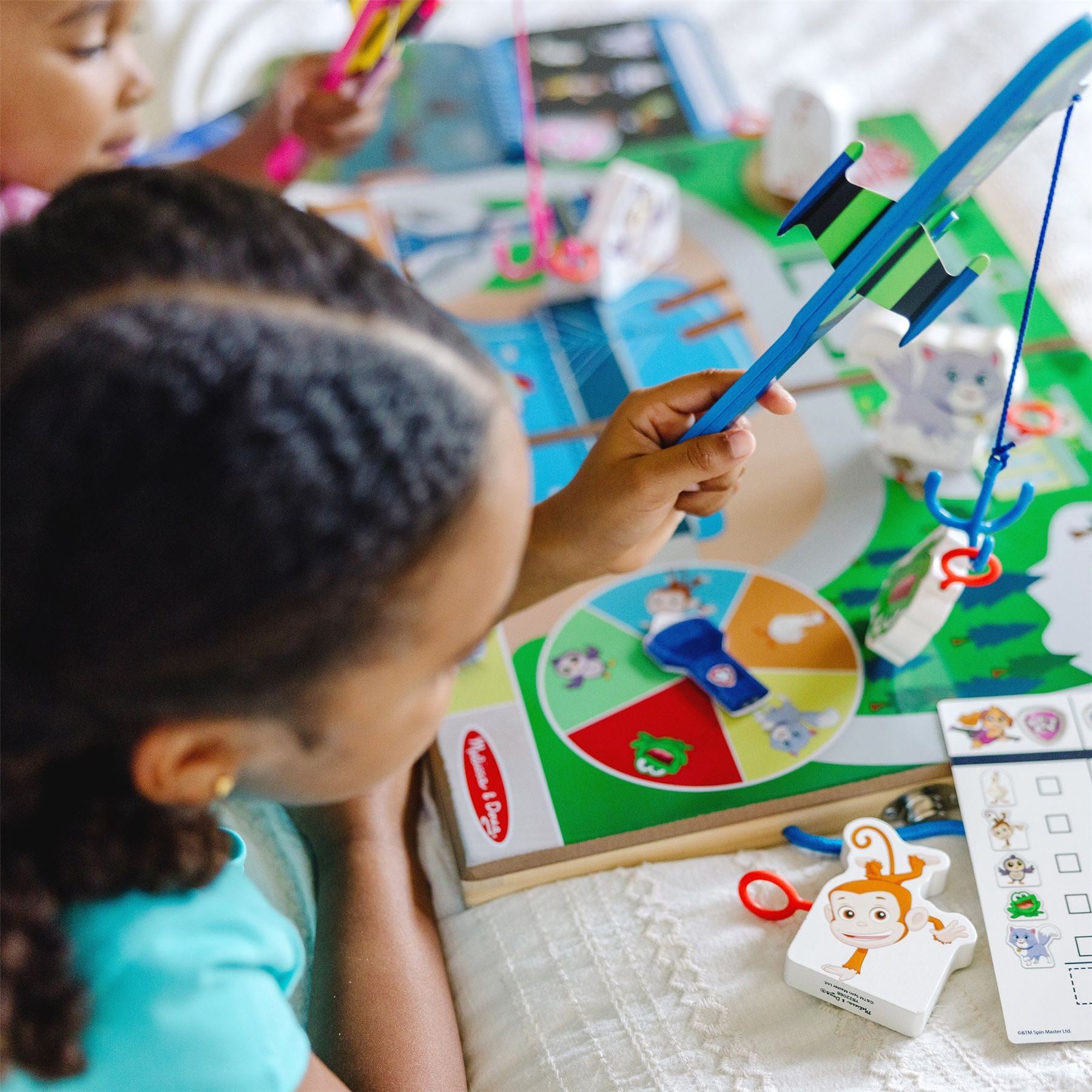 Join super spies Chase and Skye from PAW Patrol™ in fun search and rescue missions with this wooden take-along play set! Place wooden play figures on the wooden fold-out game board, spin the spinner, and use the drone-shaped fishing rods with matching badges to hook and move the indicated character to its safe spot! Play against an opponent or work together to rescue all the characters! The Flashlight Finder Pup Pad offers more search-and-find activities. All pieces store in the wooden take-along case. PAW Patrol™ is always ready to help, inspiring preschoolers with a blend of teamwork, adventure, and humor as they develop social, emotional, and developmental skills through play. This product is certified by the Forest Stewardship Council. FSC certification ensures that products come from responsibly managed forests that provide environmental, social, and economic benefits, and that forests are protected for future generations. Please note that FSC certification applies to new inventory only (FSC C156584)