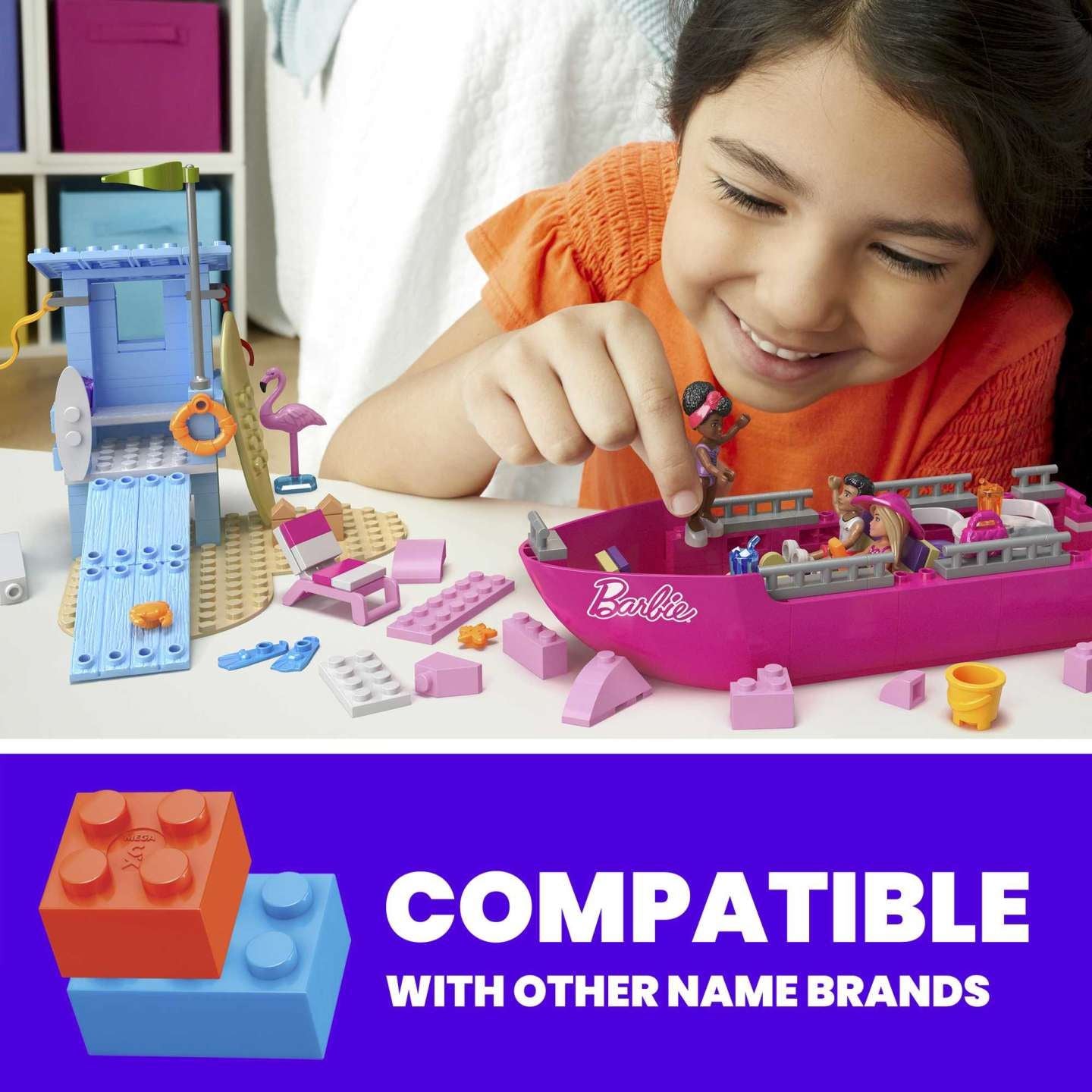 Kids can join Barbie and her friends for a beach splash adventure when they build the Malibu Dream Boat. This buildable Dream Boat features lounge chairs, TV, seating area, slide and sundeck. The top of the boat can be easily removed to access the main deck for interior play. Kids can also build the Malibu lifeguard tower with an outdoor shower and paddle board to ride the wave. Buildable Barbie Dream Boat includes lounge chairs, TV, seating area, slide and sundeck 317 bricks include 3 buildable Barbie micro-dolls, 2 pets, fashion and beach accessories Buildable Malibu lifeguard tower includes an outdoor shower and a long surfboard to ride the wave Pieces combine with all MEGA and Barbie buildings toys, and are compatible with other name brands Ideal for ages 6+, these building toys help to develop creativity and problem-solving skills