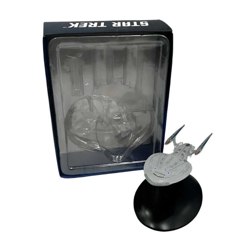 This Eaglemoss model is a finely crafted replica of the Enterprise-F, measuring approximately 135 mm in length. Constructed from die-cast metal and high-quality ABS plastic, it faithfully captures the sleek and imposing design of the Odyssey-class, complete with its distinctive Federation livery and intricate hull detailing. Each model is meticulously painted, ensuring screen-accurate colors and authentic in-game appearance.