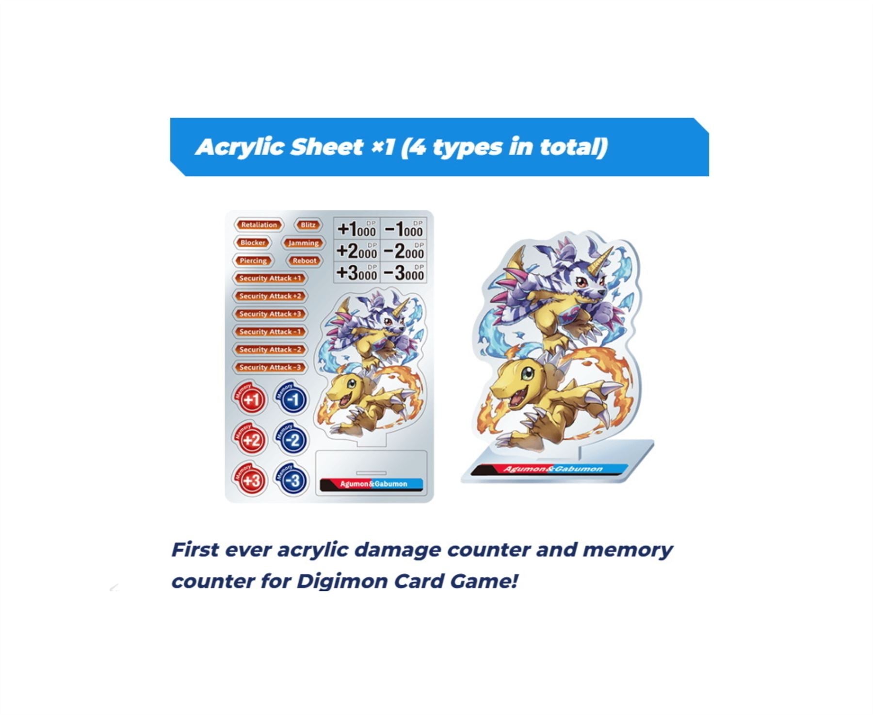 Take your Digimon battles to the next level with the Digimon Card Game Gift Box 2022 (GB-02)! This premium gift set is packed with exclusive items for collectors and competitive players alike. Featuring the first-ever acrylic damage and memory counters, plus 5 EX-03 booster packs and a promo card, this box is a must-have for any serious Digimon TCG fan. Perfect as a gift or for boosting your own collection! Key Features: Exclusive Acrylic Damage & Memory Counter: The first of its kind for the Digimon Card Game. 5 Booster Packs (EX-03): Expand your deck with powerful new cards. Promo Card Included: 1 random promotional card out of 4 possible types. 2 Large Memory Gauges: Track gameplay with ease using the oversized gauges. Collector-Friendly Packaging: Ideal for gifting or displaying in your collection. Box Contents: 5 x EX-03 Booster Packs 1 x Acrylic Sheet (1 of 4 variations) 2 x Large Memory Gauges 1 x Promo Card (random from 4 types)